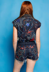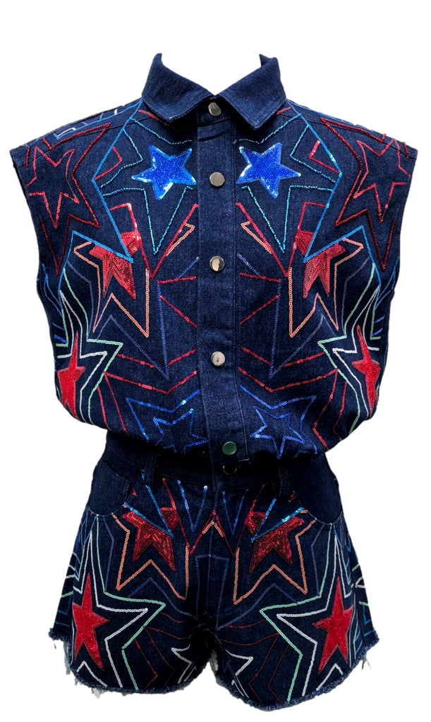 The GROOVY STAR Romper by QUEEN OF SPARKLES is denim—but make it disco. All-over sequin stars, flirty fit, and vintage-cool energy? Yeah, this is your main character moment.