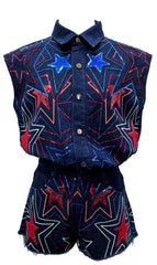 QUEEN OF SPARKLES Denim Sequin GROOVY STAR Short Romper