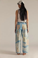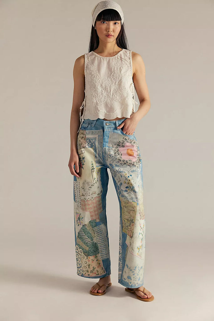 Features: Rigid denim fabrication, barrel-inspired legs, 5-pocket styling, digitally printed trompe-l'œil effect designed to mimic patchwork