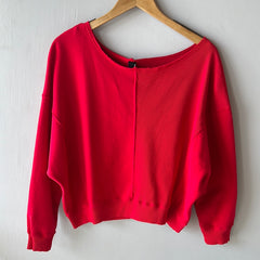 This boatneck top features a unique mix of terry and rib, drop shoulder, off shoulder neckline, and a loose fit throughout the body. You can wear it as a wide neckline or off one shoulder. A new sweater that is sure to stand out!