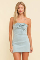 Embrace the charm of modern fashion with our Cloud Ten Strapless Bow Detail Denim Mini Dress. This contemporary piece is a nod to the edgy yet chic woman, combining the playful essence of a bow detail with the classic appeal of denim. Designed and meticulously crafted in Los Angeles, this dress is a testament to our commitment to trendy, high-quality women's clothing. Whether you're heading out for a brunch or a casual day out, this denim mini dress ensures you stand out in style.