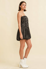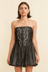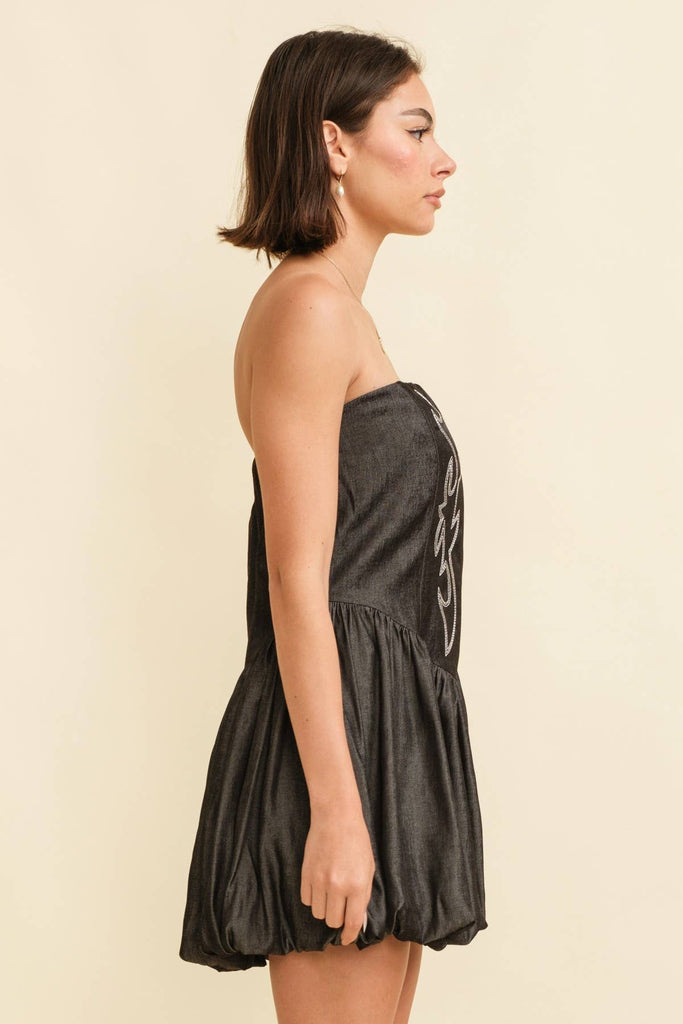 EMBROIDERY DESIGN PUFF BOTTOM MINI DRESS WESTERN INSPIRED Model is wearing a small Height: 5'5" Bust: 34A Waist: 26" Hips: 35"