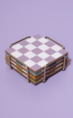 Add a touch of retro to your space with this set of funky-colored checkered coasters. The coasters come with a sleek, vintage-modern stand in gold metal, adding an extra layer of sophistication. Whether you're entertaining guests or simply enjoying a quiet night in, this set brings a dash of charm to your home while keeping your surfaces pristine.