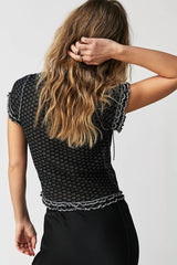 So sweet and simple with a little extra detail, this comfy and cute baby tee is featured in a semi-sheer, floral fabrication with a flattering scoop neckline and dainty ruffle trim.