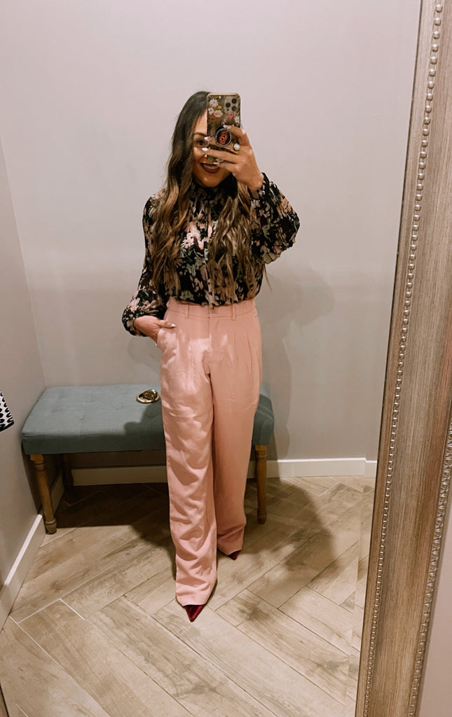 LUCY PARIS Pleated LISSIE Floral TieNeck ButtonDown Top