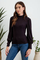 MOCK NECK LONG SLEEVES BISHOP SLEEVES BACK BUTTON NON FUNCTIONAL BUTTONS SOLID SWEATER KNIT RIBBED KNIT TOP 95% RAYON, 5% SPANDEX
