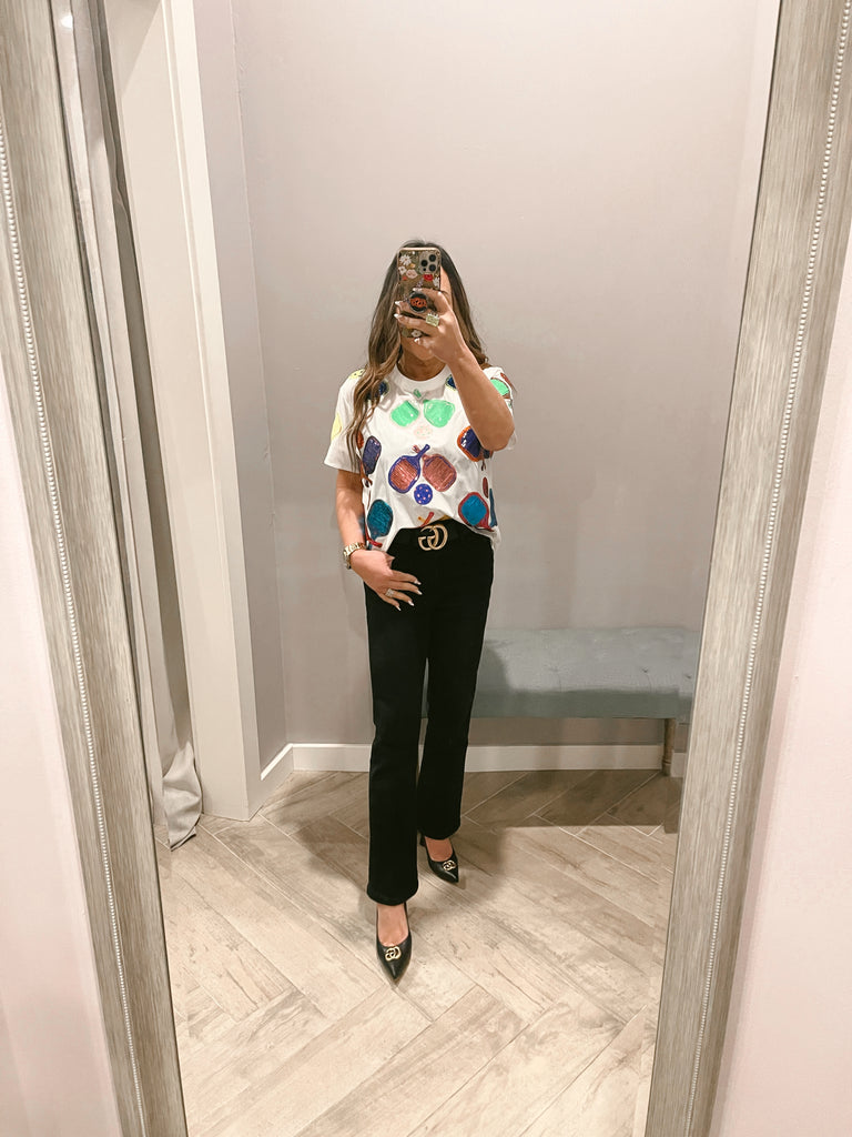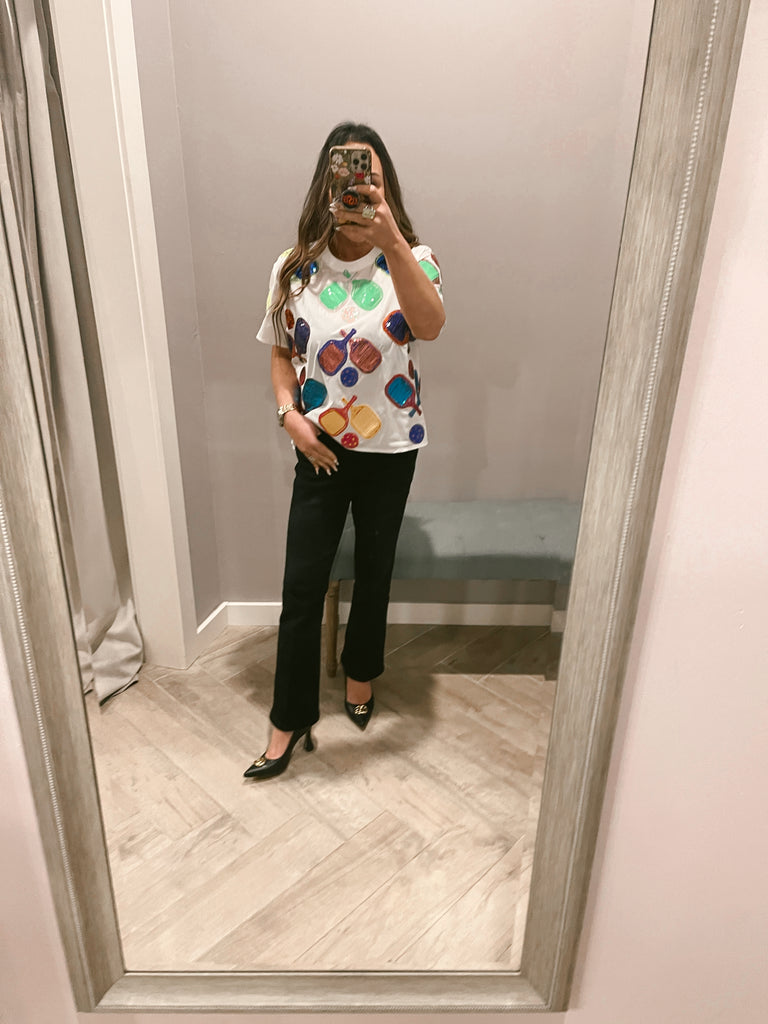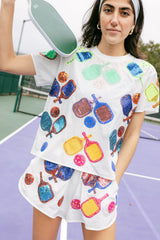 Elevate your pickleball game with our White Pickleball Active Tee. Designed with a loose and light-weight fit, this tee ensures optimal comfort during play. The sequin-scattered pickleball design adds a touch of fun and style!