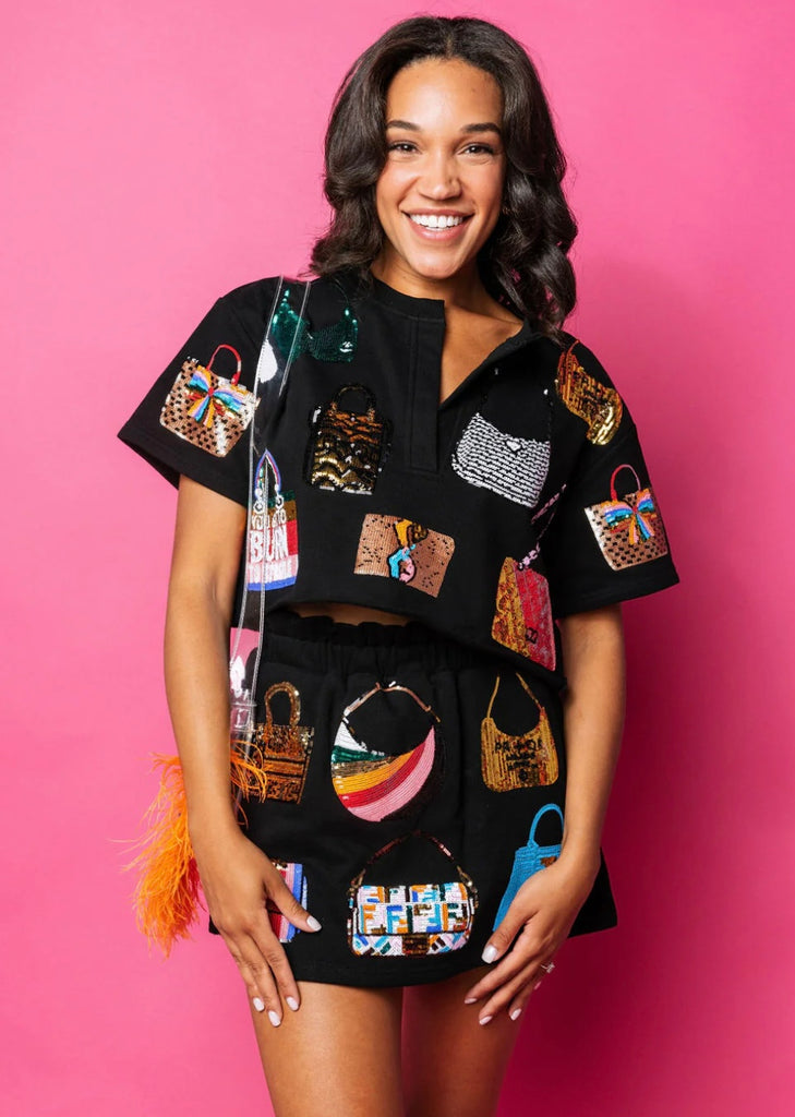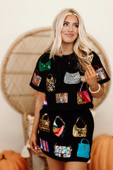 Shine with every step in the QUEEN OF SPARKLES Sequin Purses Top! This dazzling top features a stunning sequin design that captures the light and showcases a chic purse motif. Perfect for adding a touch of glamour to any outfit, it blends high-fashion sparkle with everyday elegance. Ideal for making a statement at any event or simply elevating your daily style, this top promises to turn heads and light up your look. Add a splash of sparkle to your wardrobe today!
