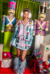Step into the season with our QUEEN OF SPARKLES Sequin Sleeve Nutcracker & Clara Shard Cardigan Top. This dazzling piece combines festive charm with luxurious comfort, featuring stunning sequin sleeves that shimmer with every movement. Perfect for holiday parties or cozy nights in, it’s a must-have for making memories that shine.
